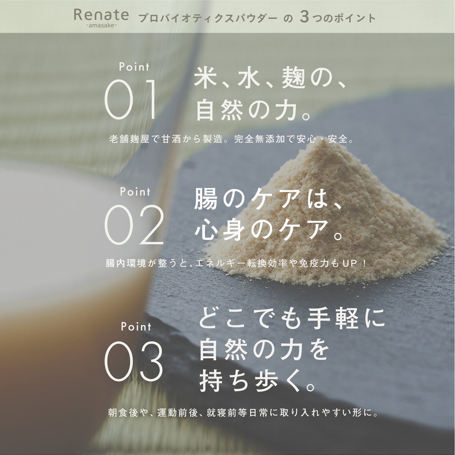 Renate生甘酒を 長時間発酵により約10万個に増加した菌を、低温乾燥させ、パウダー状にしました。パウダー状に圧縮させることで一回で摂取できる菌数は約2億個となり、より効率的に生きた菌を腸に届けることが可能となりました。